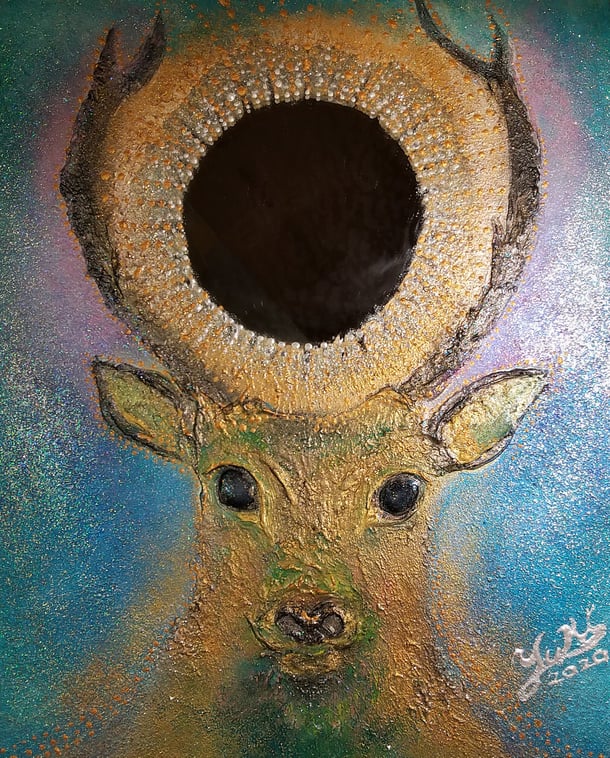 鏡に段々と浮かんでくる鹿を描きながら、毎日、この鏡に自分を映してみて、本当の自分って何だろうって考え続けることも良いかなと思っていました。本当の自分を見ようと思って過ごすことは大切なのかもしれません。