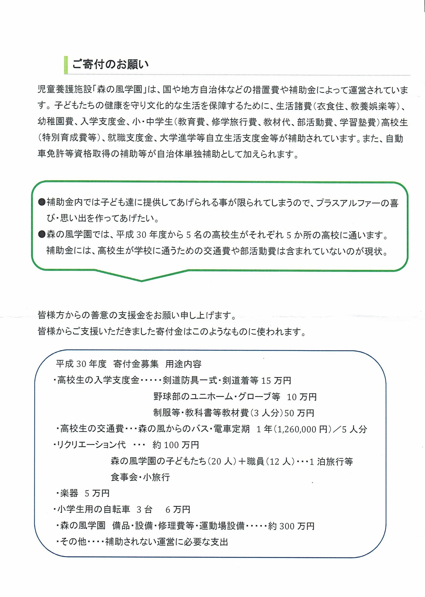 森の風学園は国や地方自治体などの措置費や補助金により運営されています。東日本大震災より時が経ち、当時小学生だった子供も高校生となりましたが、高校生が学校に通う為の交通費や部活動費等は補助金には含まれていないのが現状なのだそうです。