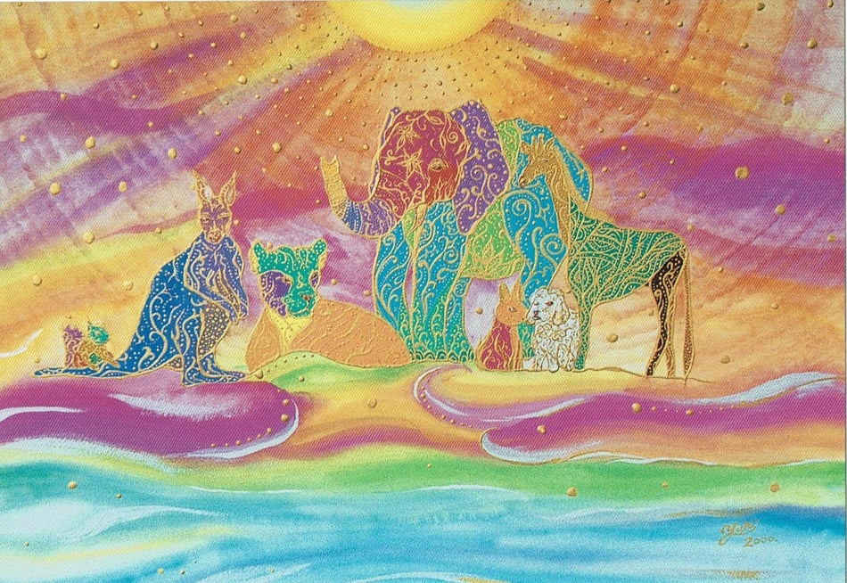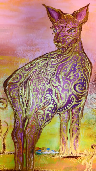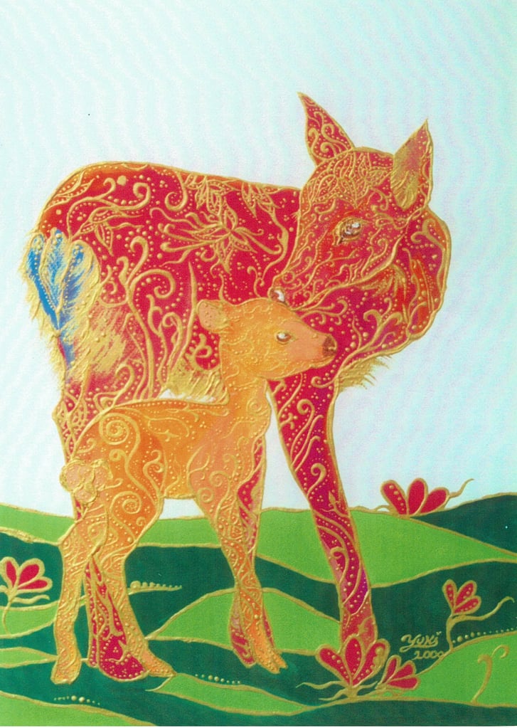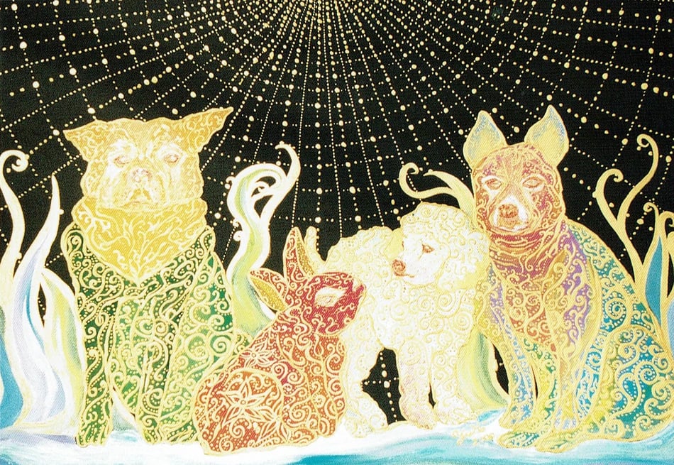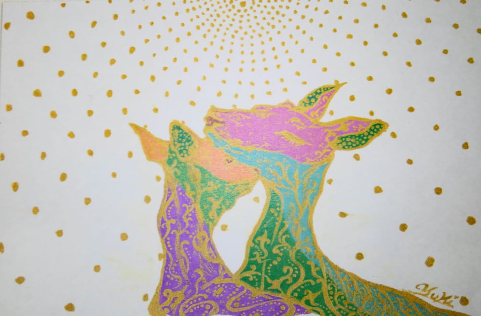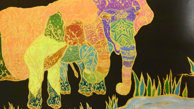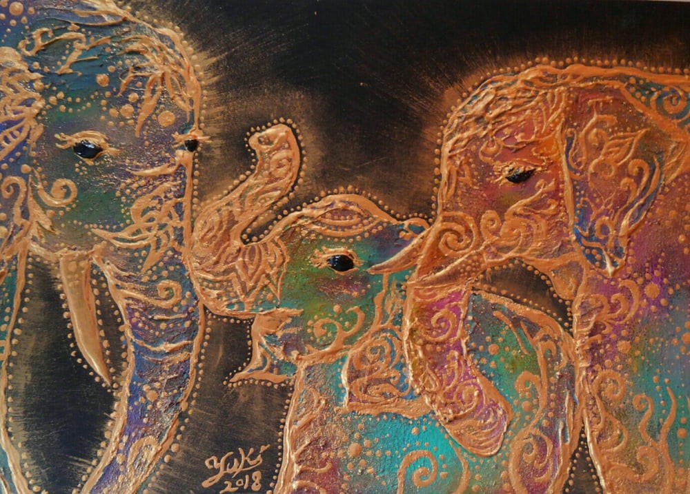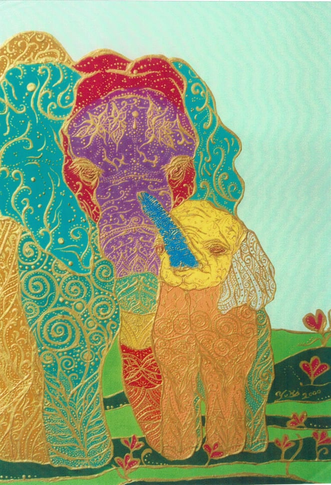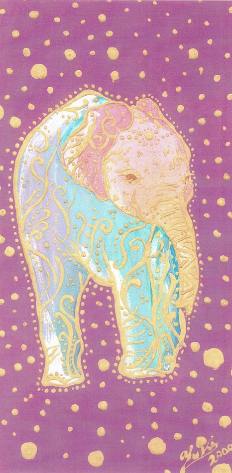 ものごころついた時から模様が大好きで模様を描いていましたが、ある時カラフルな模様の象が何度も目の前に浮かぶようになりました。この象を描くには金色を使わなきゃと強く感じ、当時は金色のポスターカラーを使用して描き始めました。(現在はアクリルや金泥、金箔等も使います)