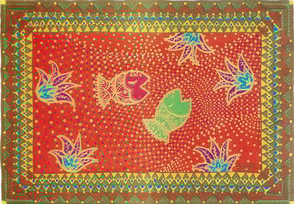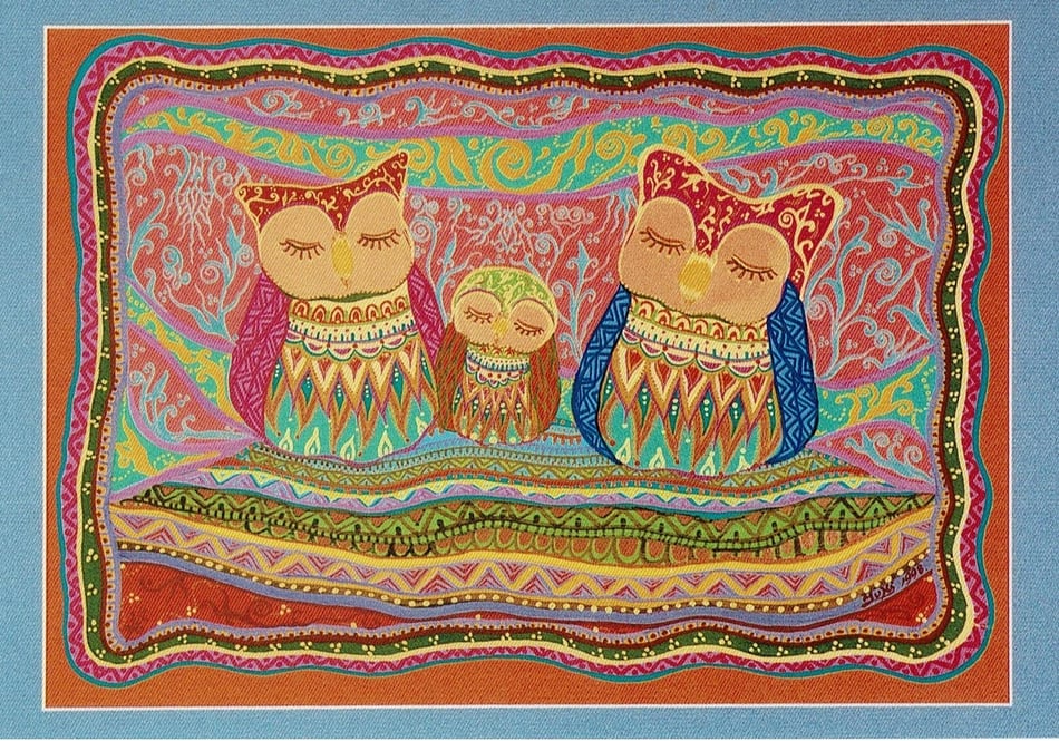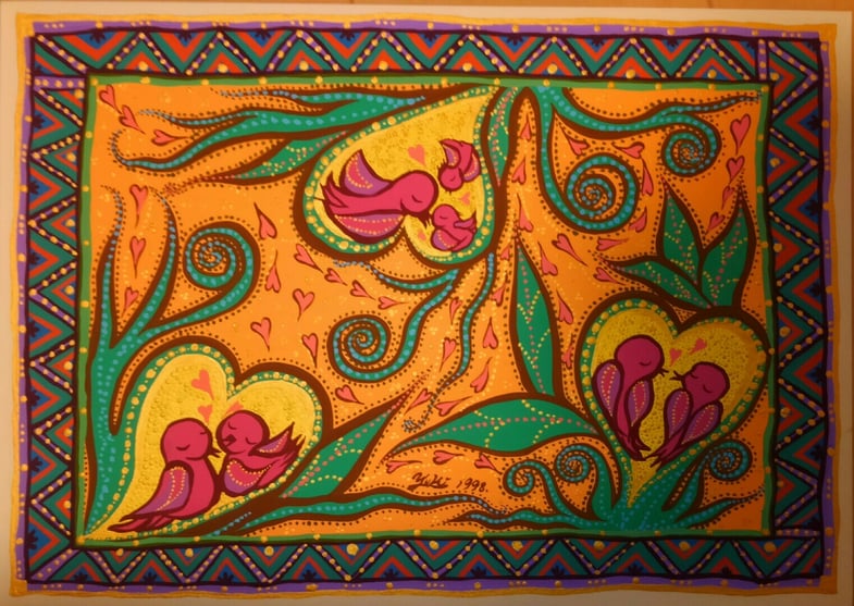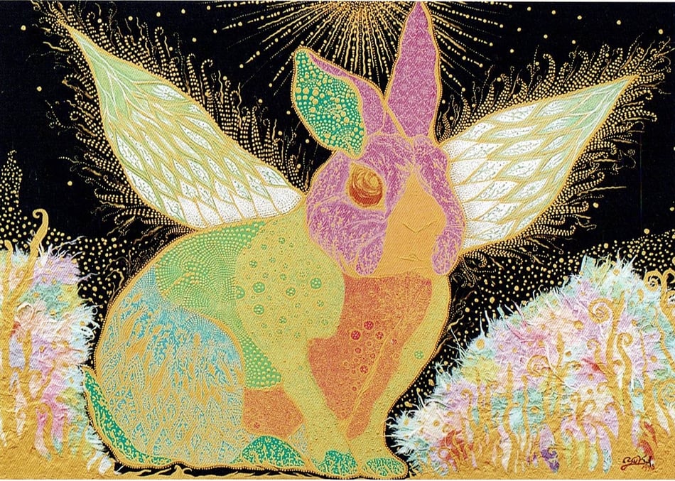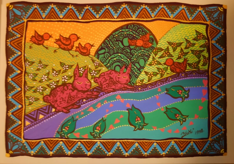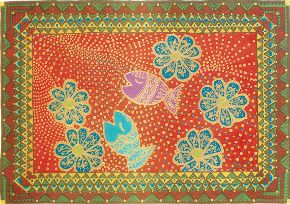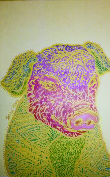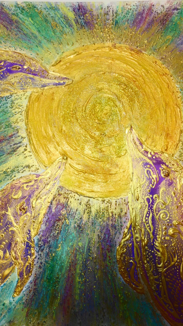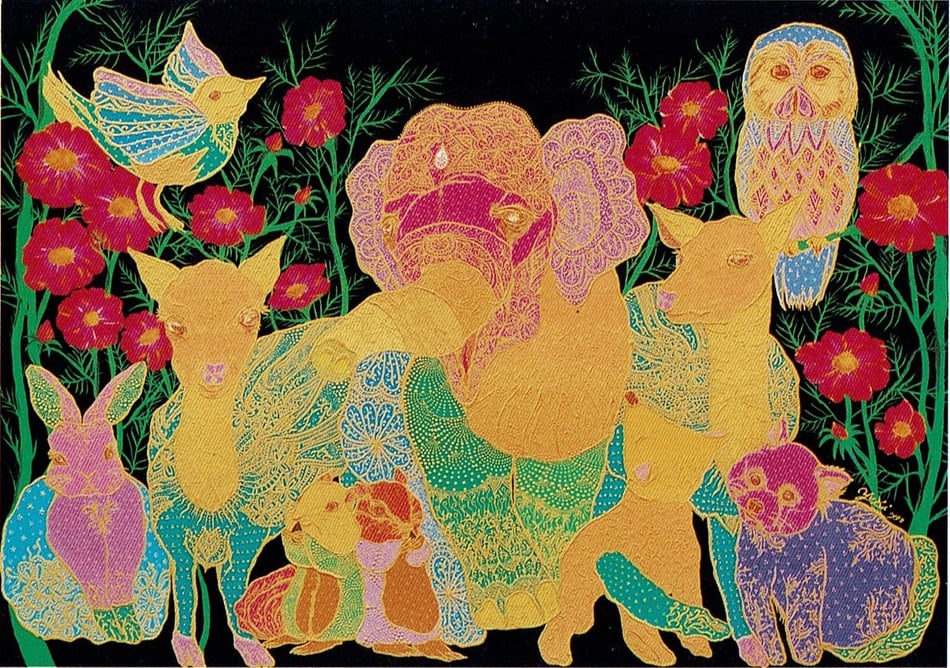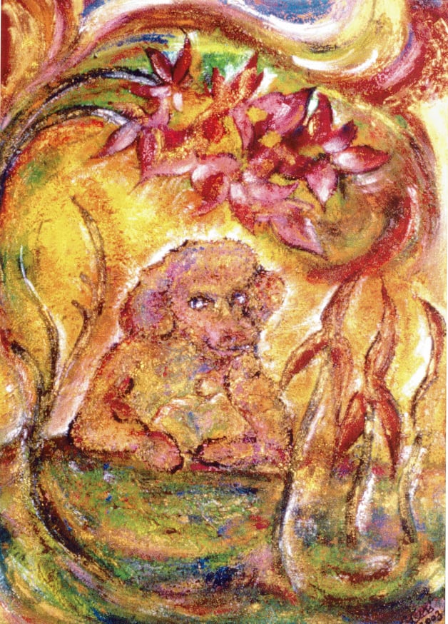 ものごころついた時から模様が大好きで模様を描いていましたが、ある時カラフルな模様の象が何度も目の前に浮かぶようになりました。この象を描くには金色を使わなきゃと強く感じ、当時は金色のポスターカラーを使用して描き始めました。(現在はアクリルや金泥、金箔等も使います)